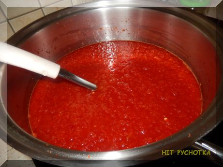 Paprykę umyć, usunąć pestki. Peperoni umyć , można usunąć część pestek, gdyby papryczki były bardzo ostre. Zmielić paprykę maszynką do mięsa ( średnie oczka ) , najpierw słodką, a następnie ostrą, do innego pojemnika. Wymieszać słodką paprykę z częścią ostrej w dużym , 5 litrowym garnku , dodając ostrą papryczkę do smaku – masa paprykowa powinna być dość ostra. Do garnka dodać olej, cukier, liście laurowe , sól . Gotować 30 min, mieszając od czasu do czasu, a następnie dodać resztę składników. Gotować sos na średnim ogniu , mieszając, aż 1/3 sosu odparuje, a sos zgęstnieje jak marmolada . Sos można przygotować bez papryki wędzonej ,cały z papryką wędzoną ( wówczas trzeba dodać 4 łyżki papryki do gotowania ) lub podzielić na pół – nałożyć do słoików połowę sosu, do reszty dodać 2 łyżki papryki wędzonej i chwilę razem gotować.