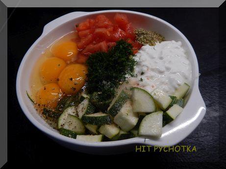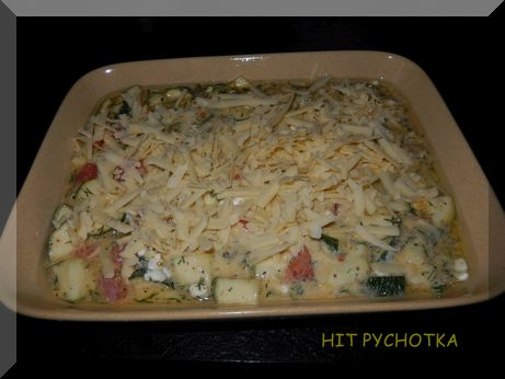 Warzywa umyć. Cukinię pokroić na niewielkie ćwierćplasterki. Pomidora sparzyć, zdjąć skórkę, usunąć pestki i pokroić pomidora w kostkę . Czosnek przecisnąć przez praskę i rozetrzeć na pastę na desce do krojenia ze szczyptą soli. Ser zetrzeć na tarce ( duże oczka) . Wymieszać wszystkie składniki zapiekanki, oprócz żółtego sera. Naczynie do zapiekania (np 18×23 cm) lekko posmarować olejem, przełożyć masę zapiekankową , posypać równomiernie serem.